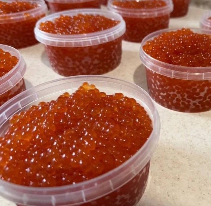Икра горбуши: яркие прозрачные икринки с ровной текстурой, которые мягко лопаются. Вкус раскрывается постепенно: лёгкая солоноватость, мягкий сливочный оттенок и бархатистая сладкая нота в послевкусии.