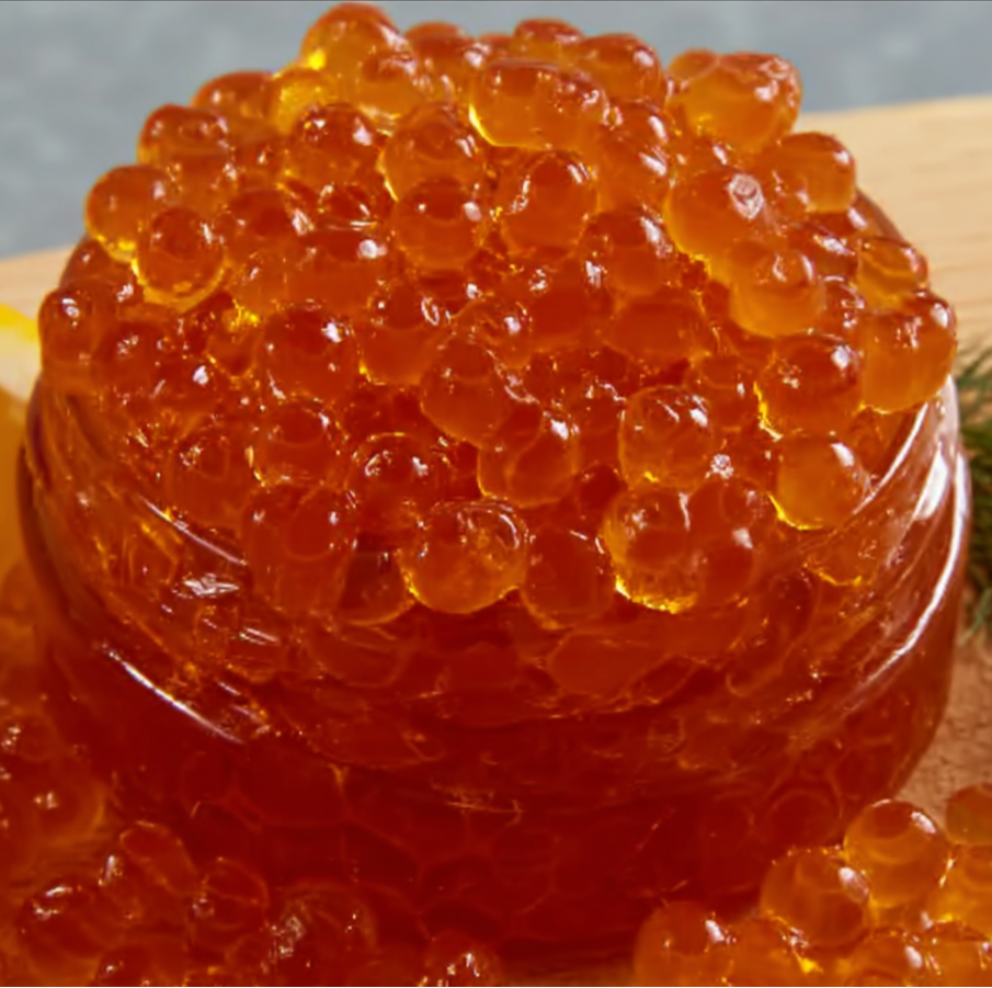Каждая икоринка крупная, диаметром 4–5 мм, с лёгкой естественной неоднородностью, полупрозрачная и насыщенно-оранжевого цвета с натуральными полутоновыми оттенками. Икра сохраняет свежесть и яркий вкус моря, идеально подходит для подачи на закуски, тосты или праздничные блюда.